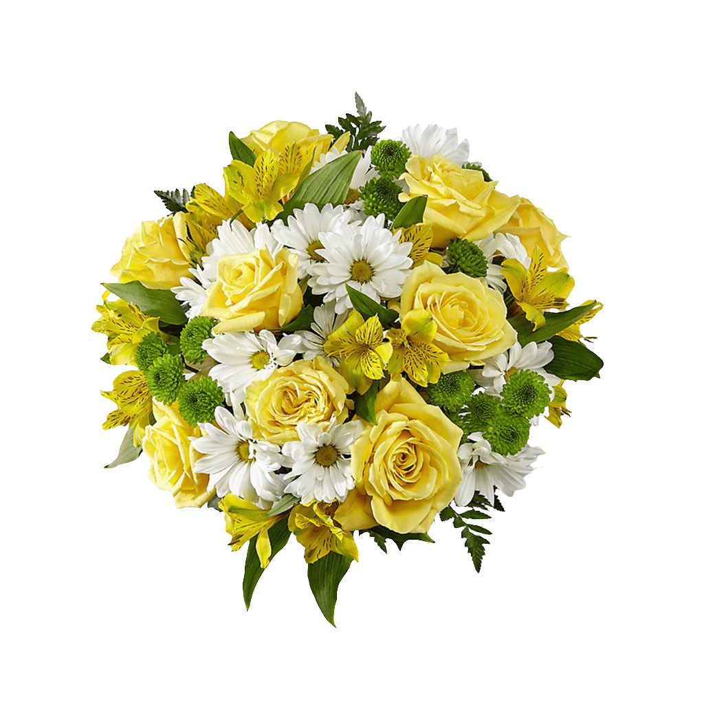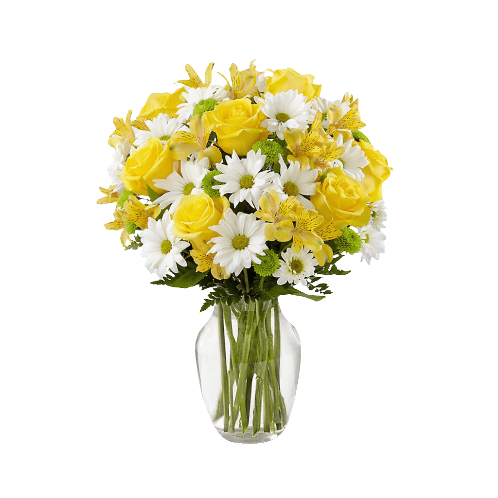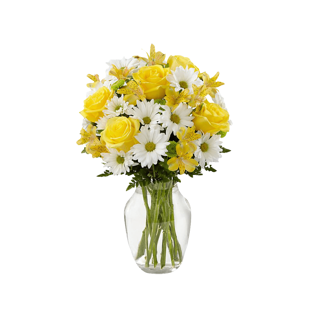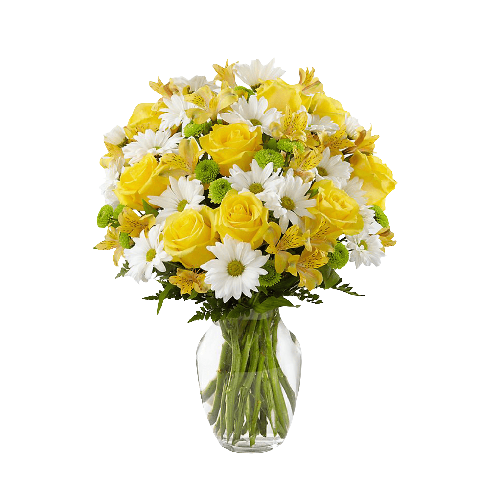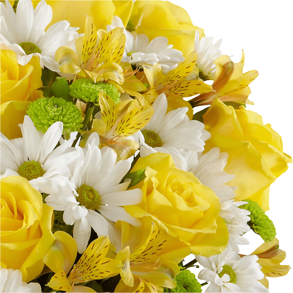 Las rosas amarillas y los lirios están listos para alegrar su día, dispuestos entre margaritas tradicionales de color blanco brillante, botones de flores verdes y follaje verdes, para crear una presentación impresionante