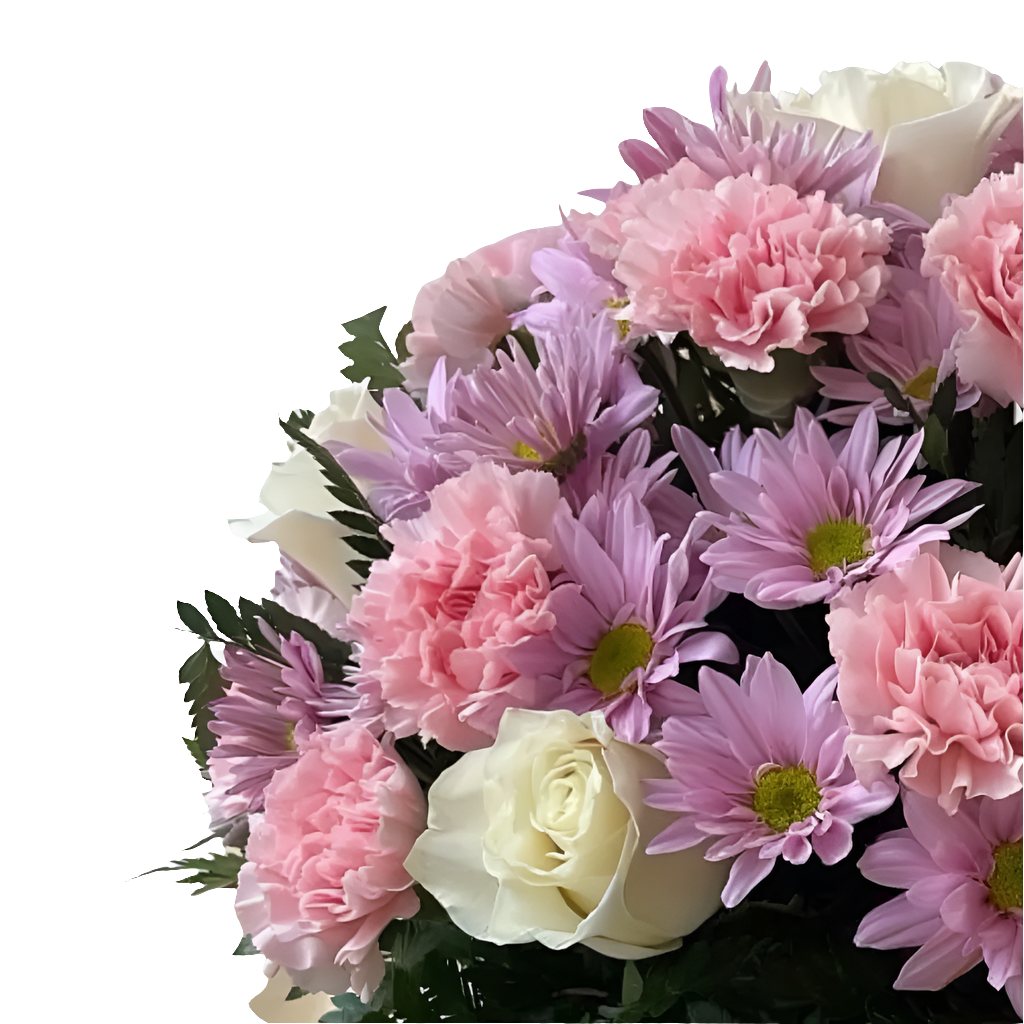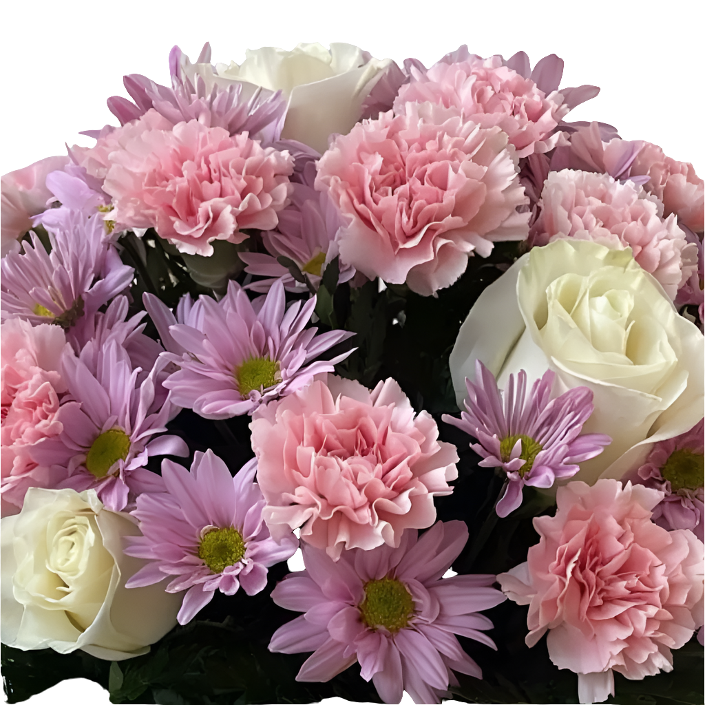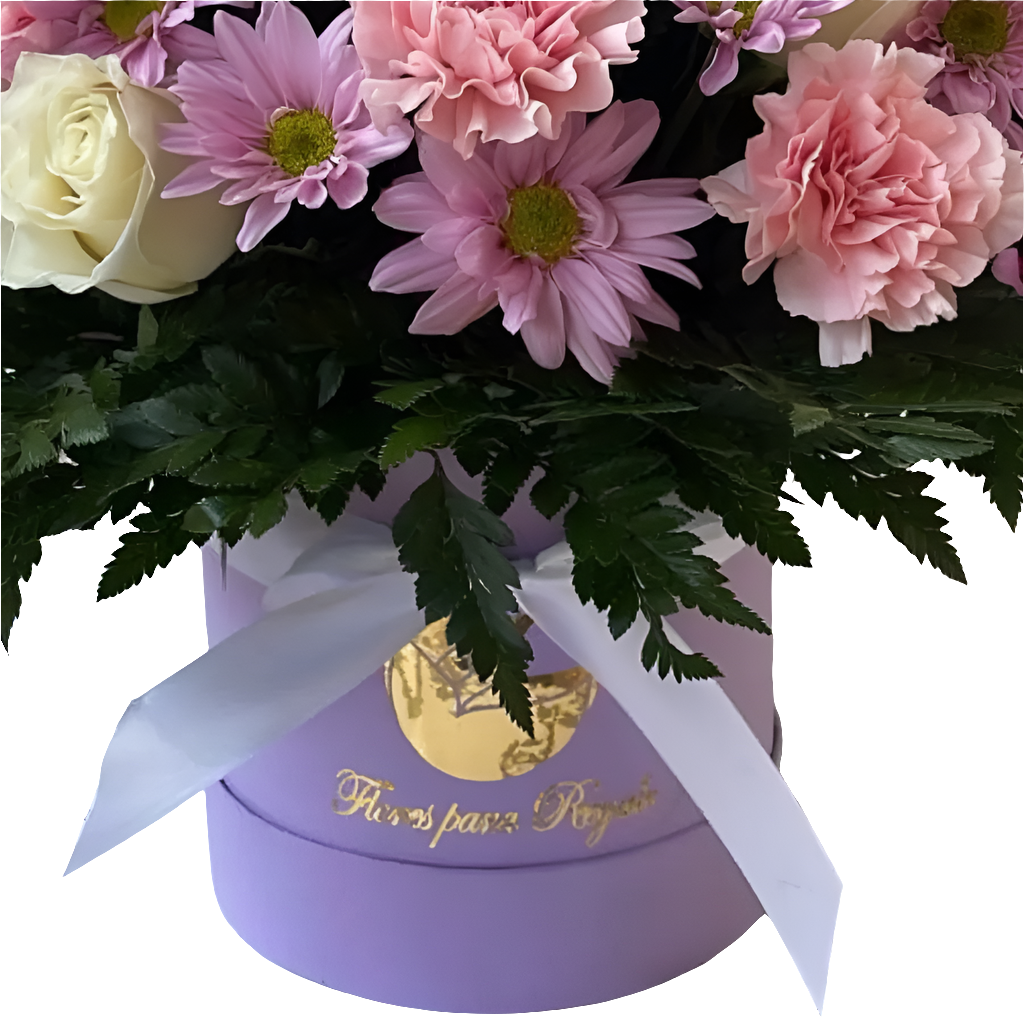 ¿Buscas una obra de arte floral verdaderamente esbelta? Esta lujosa caja lila combina rosas beige claro con claveles rosados y margaritas lilas, creando una composición que cautiva todos los sentidos.