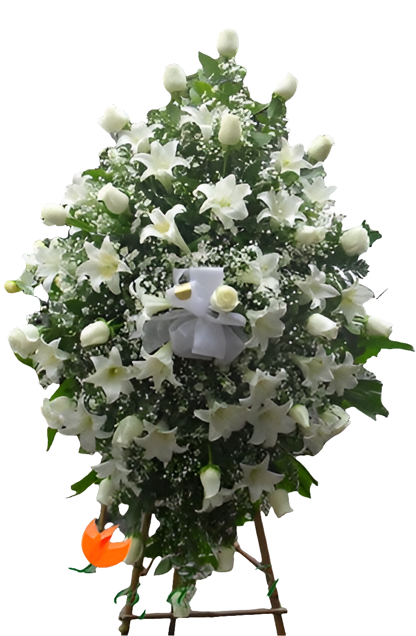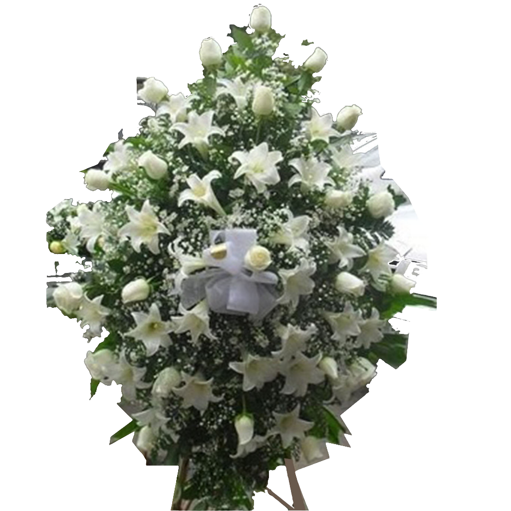 Tranquilidad ramo Funeral - Ramo Fúnebre en Pedestal" es un conmovedor ramo de flores blancas diseñado para llevar al funeral, ofreciendo consuelo y apoyo en momentos de pérdida. Este hermoso arreglo combina rosas blancas, lirios y follaje verde, creando una composición armoniosa y serena. Las rosas blancas simbolizan pureza y amor eterno, mientras que los lirios añaden una sensación de paz y serenidad. El follaje verde complementa perfectamente las flores, aportando frescura y vida al arreglo. Colocado sobre un pedestal, este ramo se convierte en un símbolo de respeto y honor hacia el ser querido que ha partido. Con su elegancia y delicadeza, "Tranquilidad en Blancura" ofrece un mensaje de condolencia profunda y solidaridad a aquellos que atraviesan por el dolor de la pérdida.