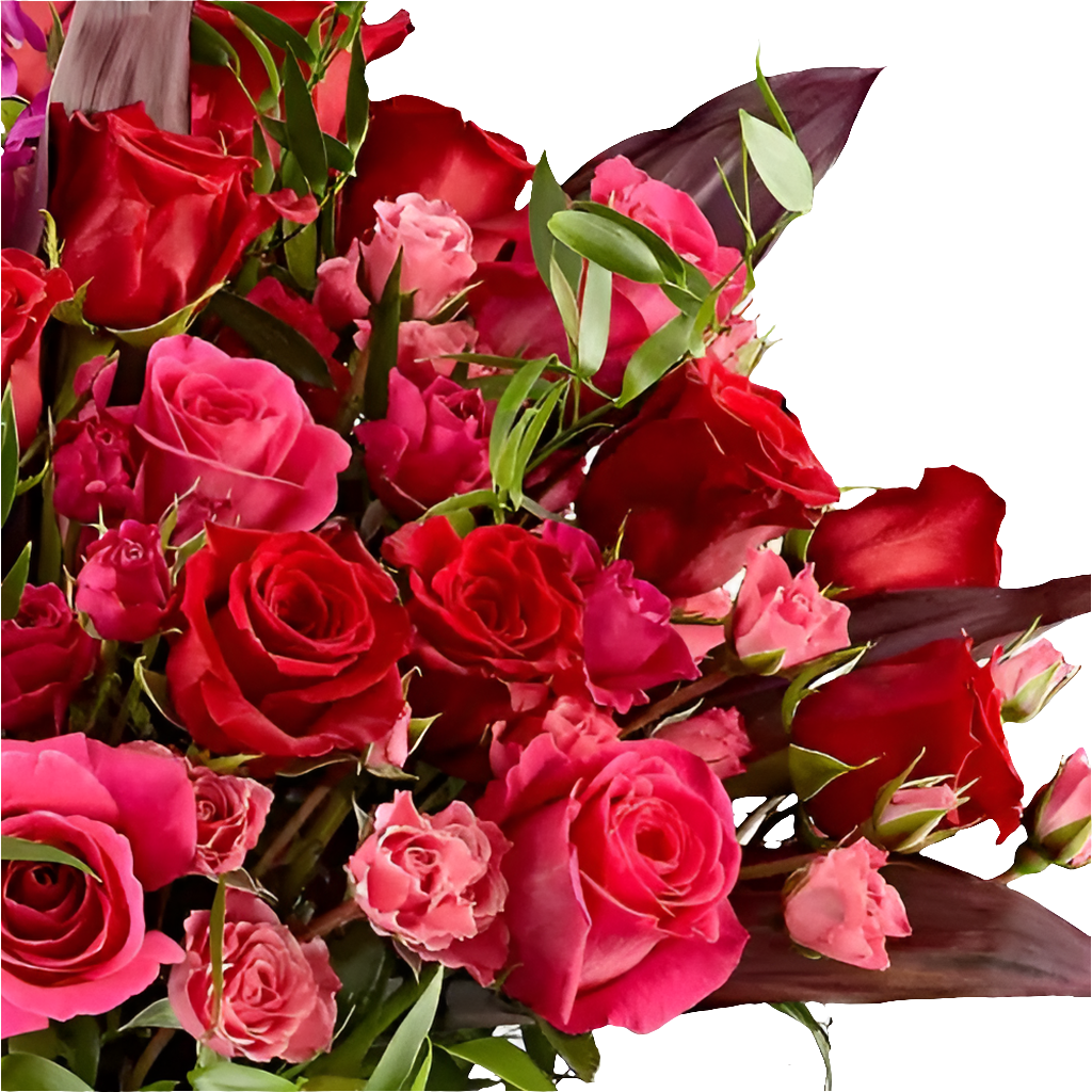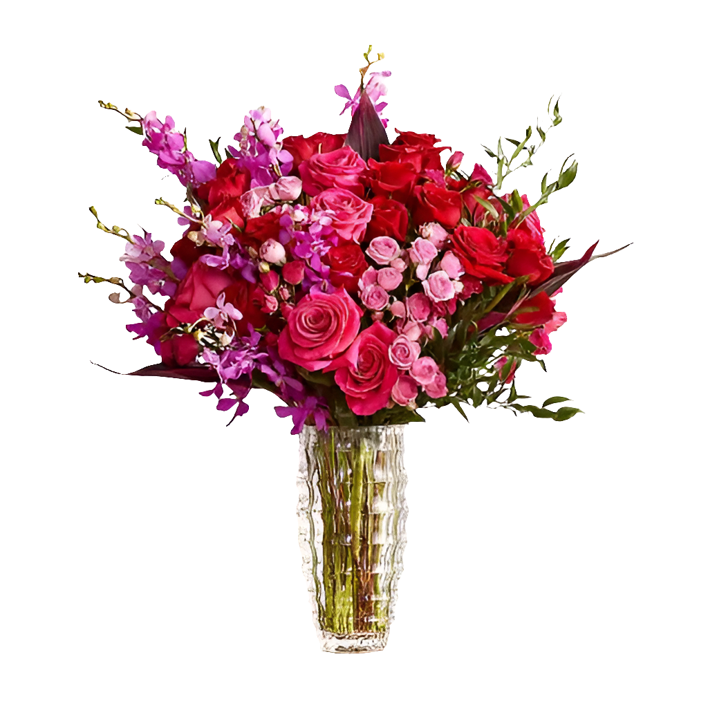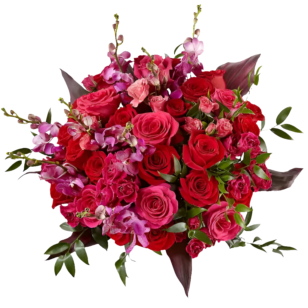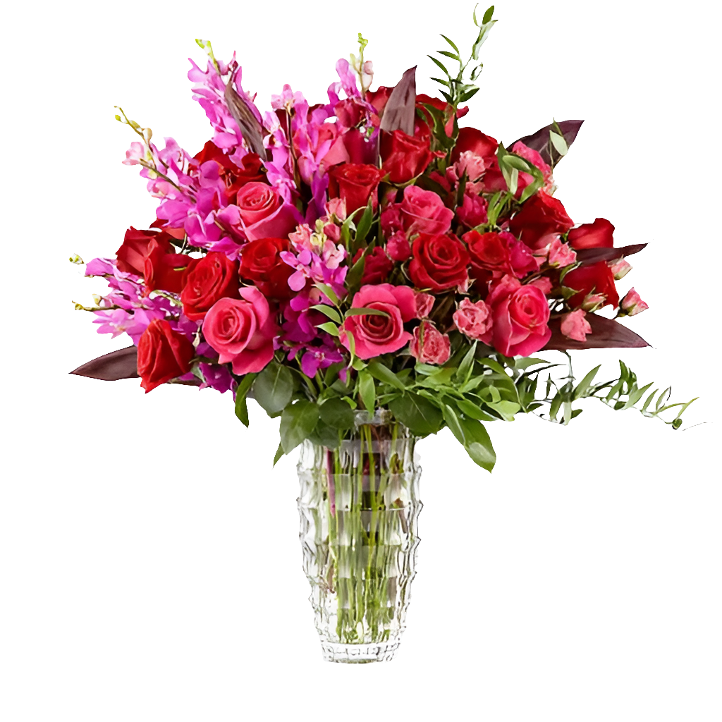 Este ramo habla del romance eterno con cada tallo, las rosas rojas ricas se mezclan con los llamativos rosados calientes de las orquídeas