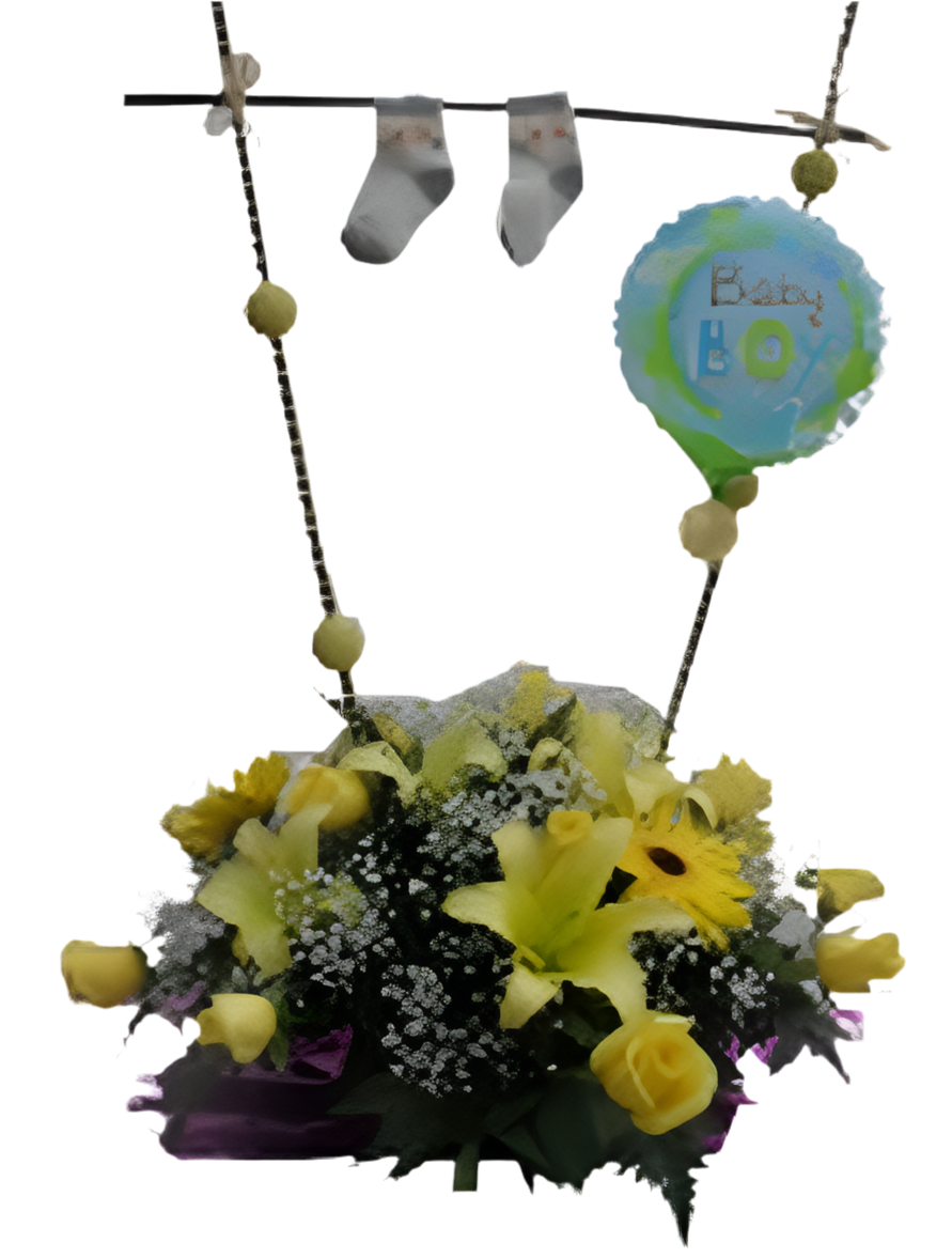 yellow flowers in arrangement, stockings and balloon. The colors may vary if requested according to the girl or boy, or shades to taste such as green and orange, surprise the daddies with a beautiful gift of flowers for the mother, the family and the newborn, flowers for baby births, gifts for a mother who has just given birth, delivery of arrangements, bouquets and gifts at home; You can also separate it and pick it up at our Floral store open to the public 24 hours