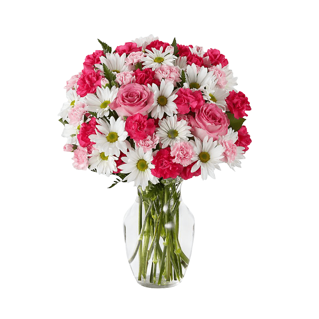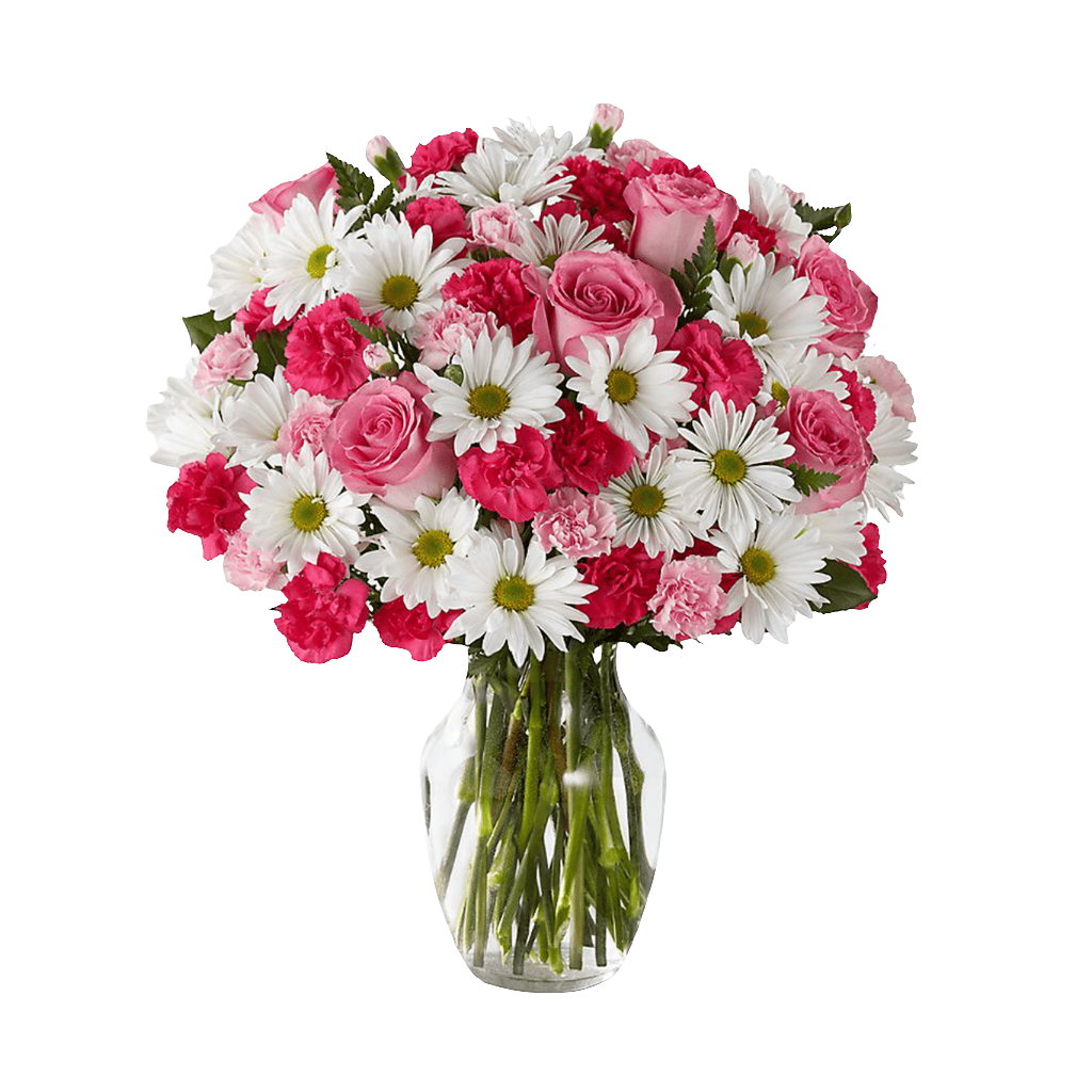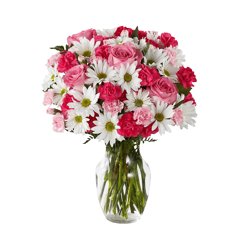 Bicolor pink roses and small deep pink and pale pink carnations stand out with their pink tones, arranged among the clean white petals of traditional daisies and green foliage