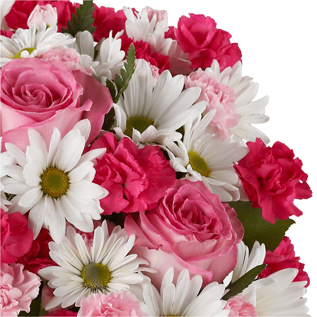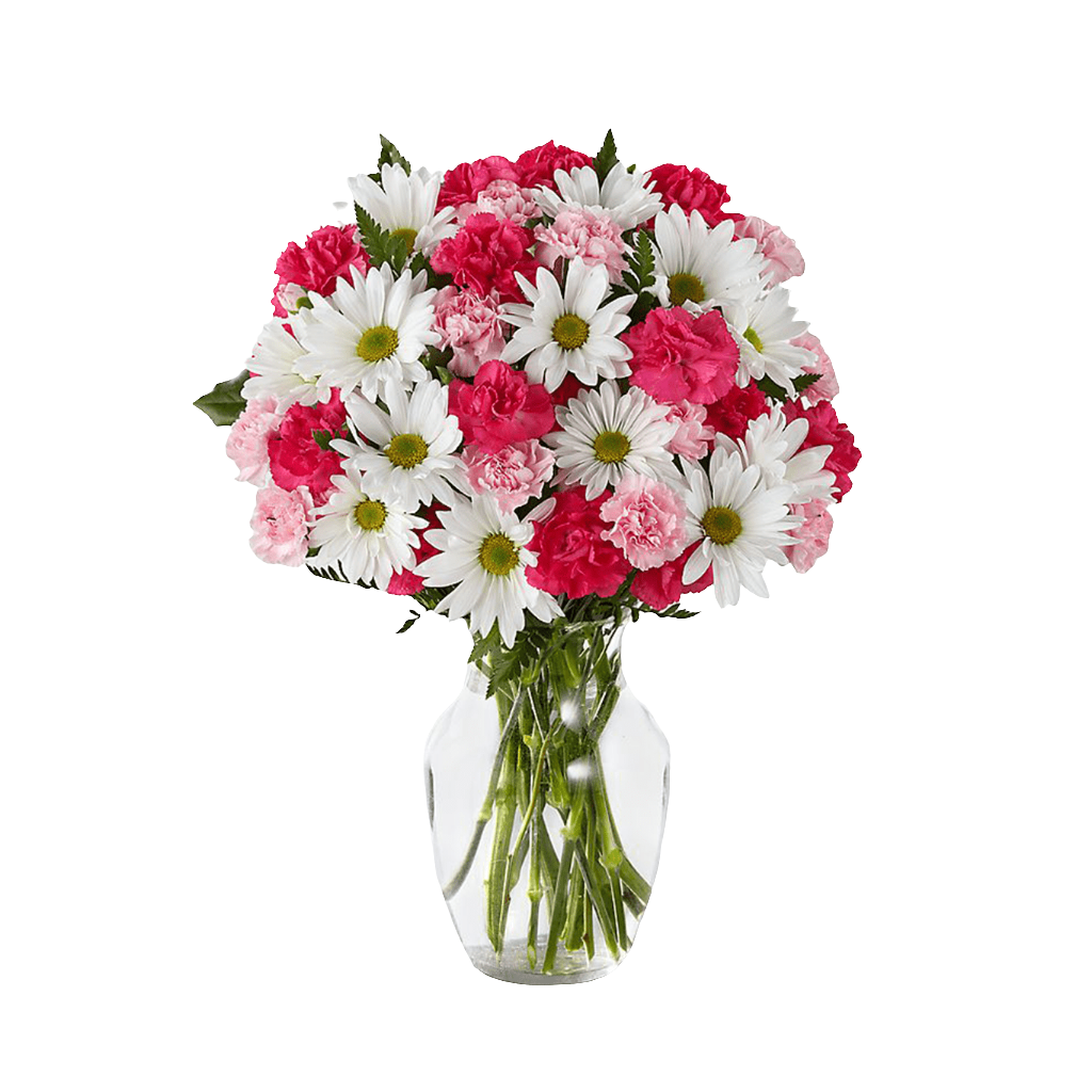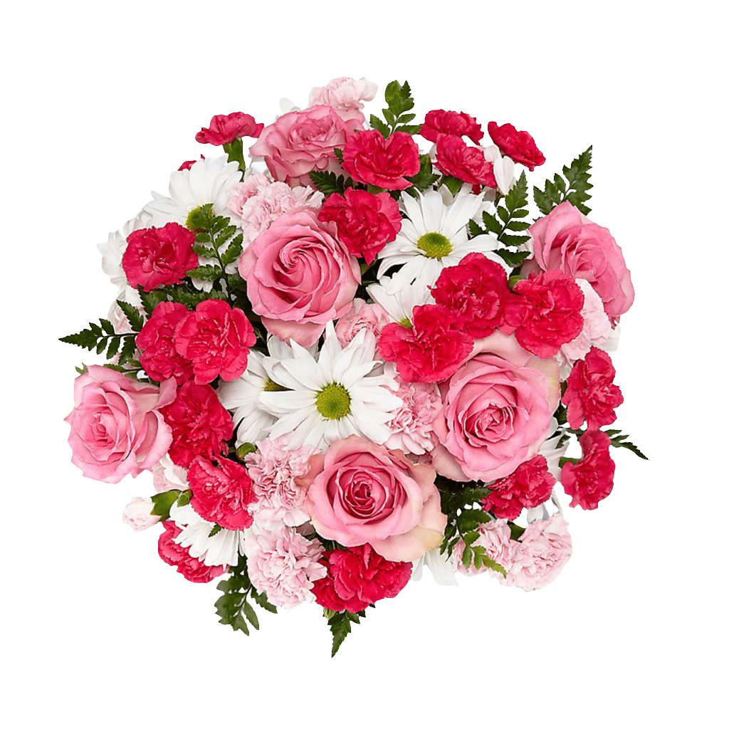 Bicolor pink roses and small deep pink and pale pink carnations stand out with their pink tones, arranged among the clean white petals of traditional daisies and green foliage