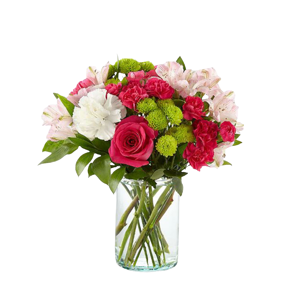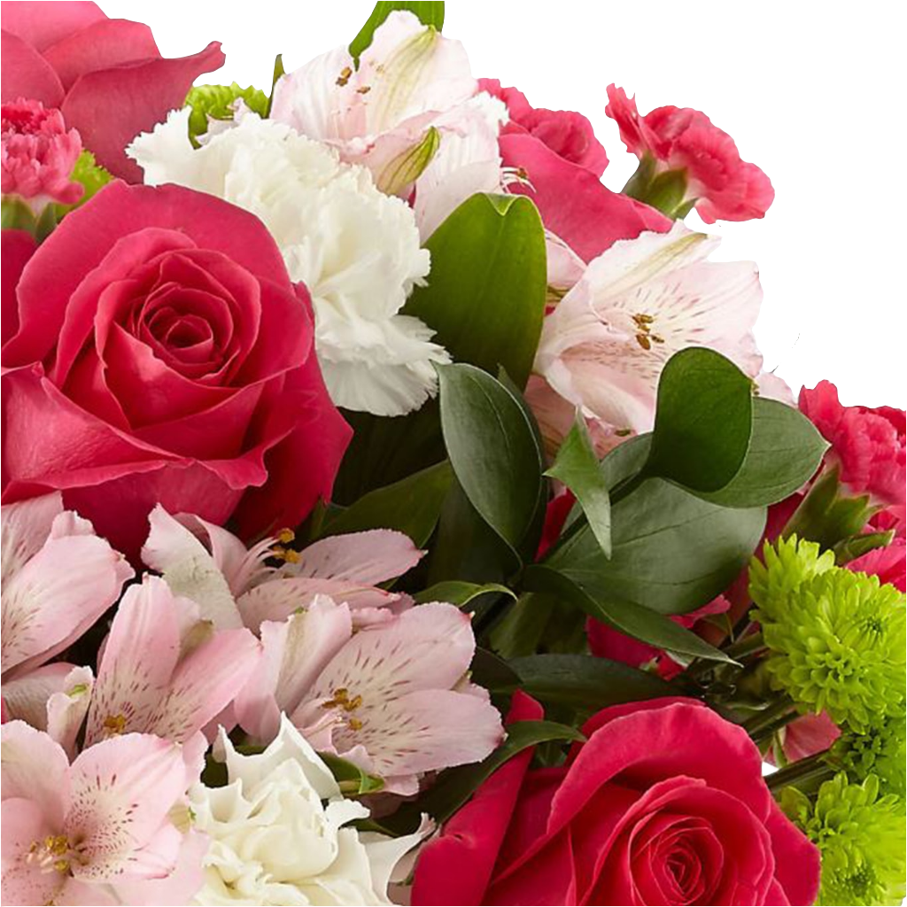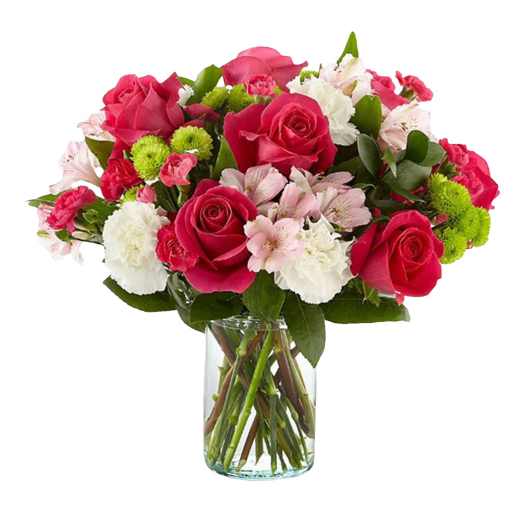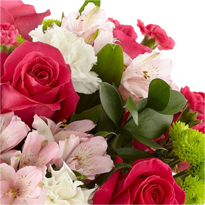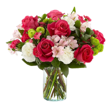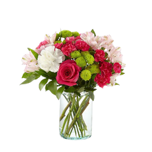 A variety of pink roses , alstroemerias and more are placed in a glass vase , making a wonderful gift to light up the recipient's face.