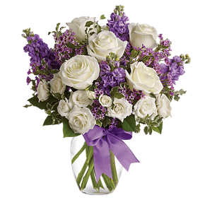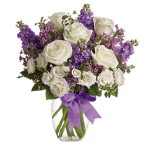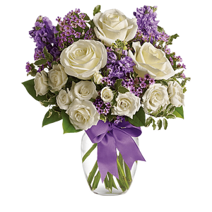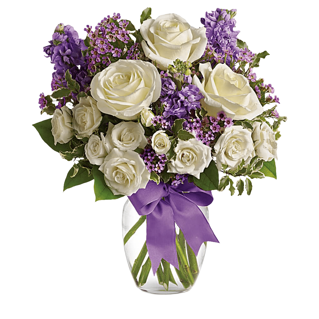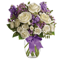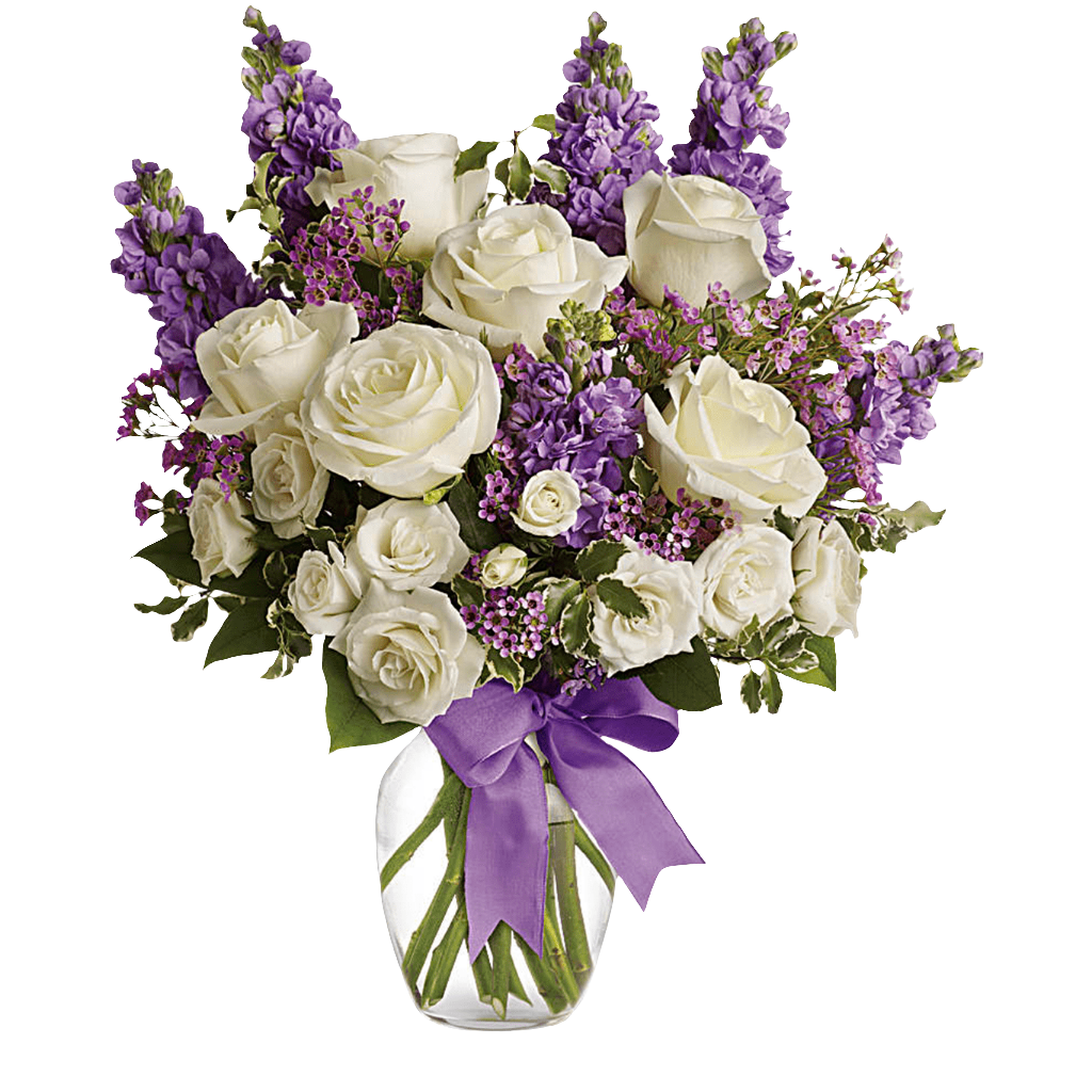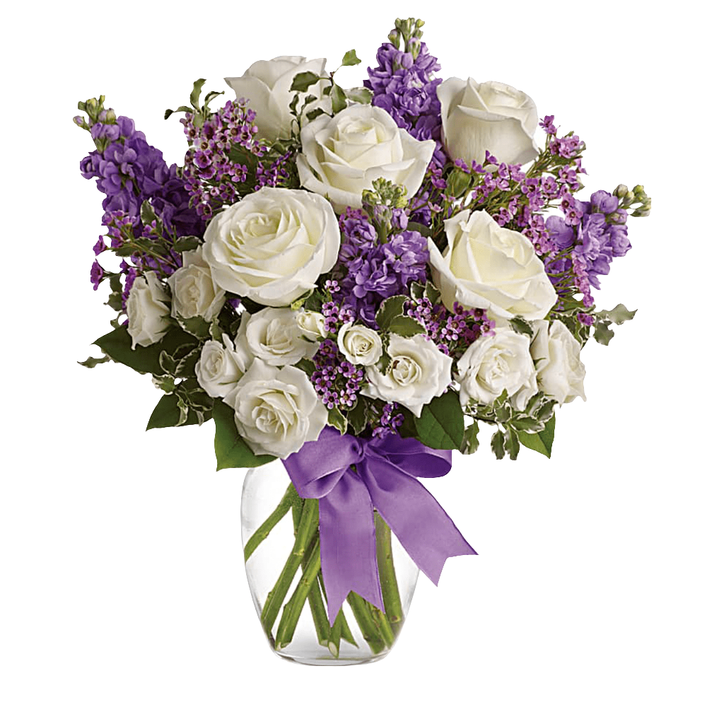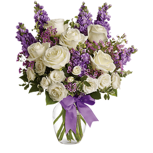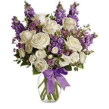 Happy Birthday Flowers As exciting as finding a surprise gift, lush white roses and purple blooms mingle with delicate lavender blooms and green foliage for an elegant English garden look.