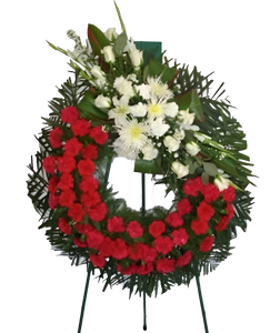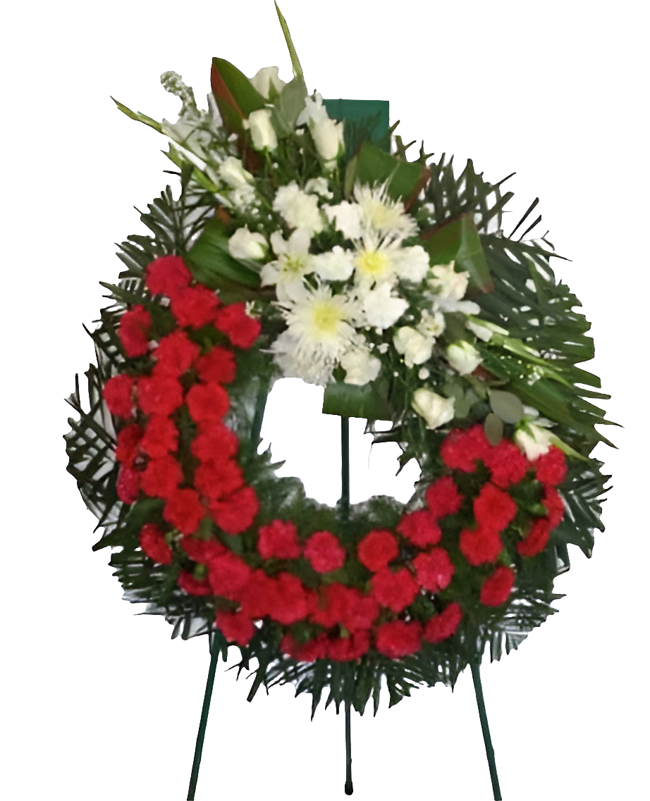 es un majestuoso arreglo funerario en forma circular que combina la intensidad del clavel rojo o las rosas rojas con la pureza de los lirios blancos y los crisantemos blancos. Esta corona floral es un tributo poderoso y conmovedor, que expresa el amor y el recuerdo eterno hacia la persona que ha partido. Las flores rojas simbolizan el amor y la pasión, mientras que las flores blancas representan la pureza y la tranquilidad. El follaje verde que acompaña a las flores aporta frescura y realza la belleza del arreglo. "Corona de Amor y Recuerdo" es una forma significativa de honrar la memoria de un ser querido, transmitiendo la profundidad de los sentimientos y el respeto hacia su vida. Este arreglo funerario crea un impacto visual impactante y duradero, recordando el legado y el amor perdurable que deja en nuestros corazones.